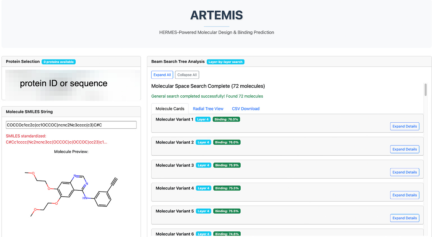 For chemists, this means Artemis is systematically exploring chemical space in a way that mirrors human-driven hit expansion, but guided by Hermes’s predictions. For ML practitioners, the analogy to beam search highlights how Artemis balances exploration and efficiency when navigating a branching search space.
