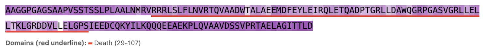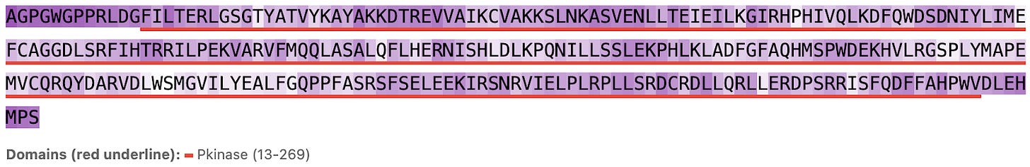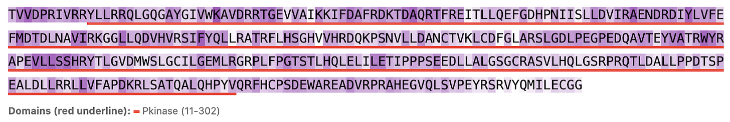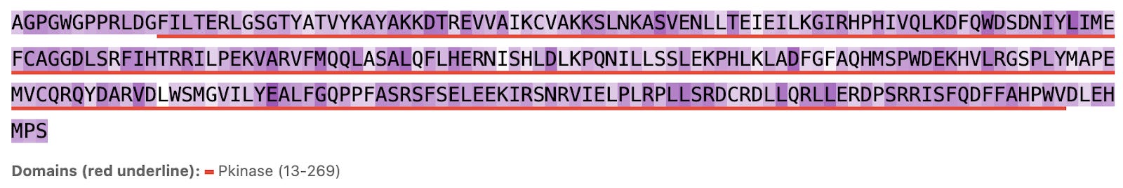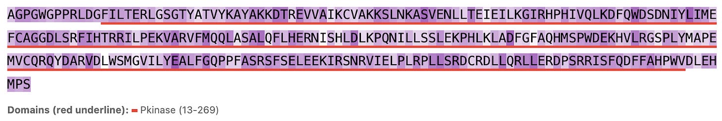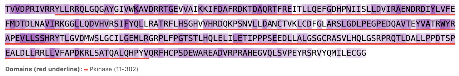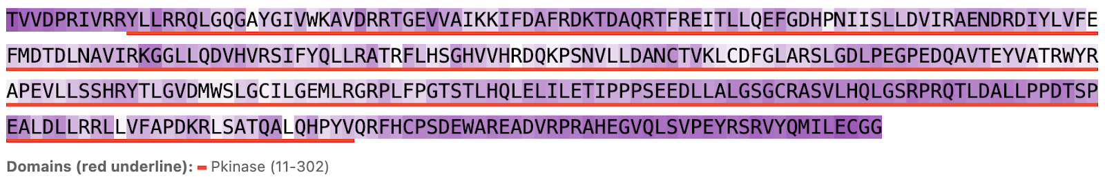 So does Hermes look at the functional part of the protein (conserved domains, underlined in red) or unique strings (less conserved outside domains)? Seems like the latter: residues within domains see less attention (lighter purple) while those outside see more (darker purple, see figures 3, 4, and 5). We show 3 proteins here (ULK3, MAPK15, and MYD88).
