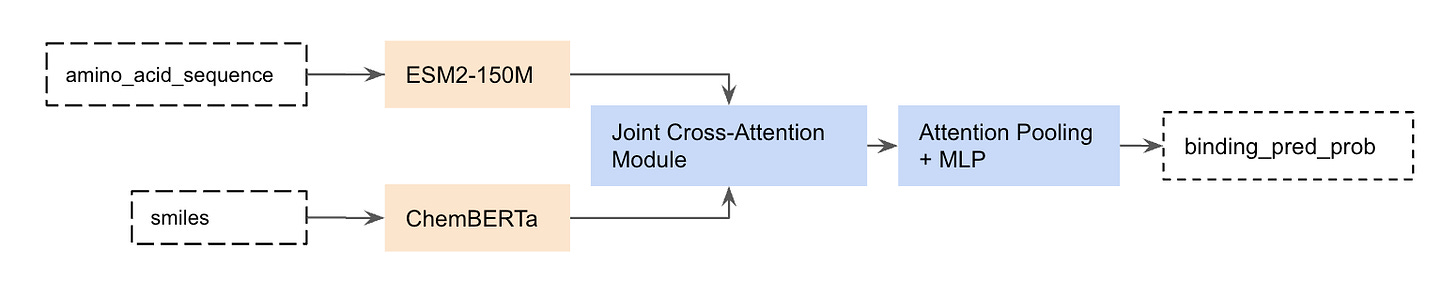One of Leash’s goals is to get better at predicting if a given small molecule binds a given protein target. We recently announced Hermes (ref 5), our lightweight PLI binding prediction model which is competitive with state-of-the-art binding prediction models like Boltz-2. The Hermes architecture is really simple: it leverages pre-trained protein and chemical embedding models ESM2 (ref 6) and ChemBERTa (ref 7), on top of which a freshly initialized cross-attention and attention-pooling module learns to predict binding likelihood from trunk embeddings.