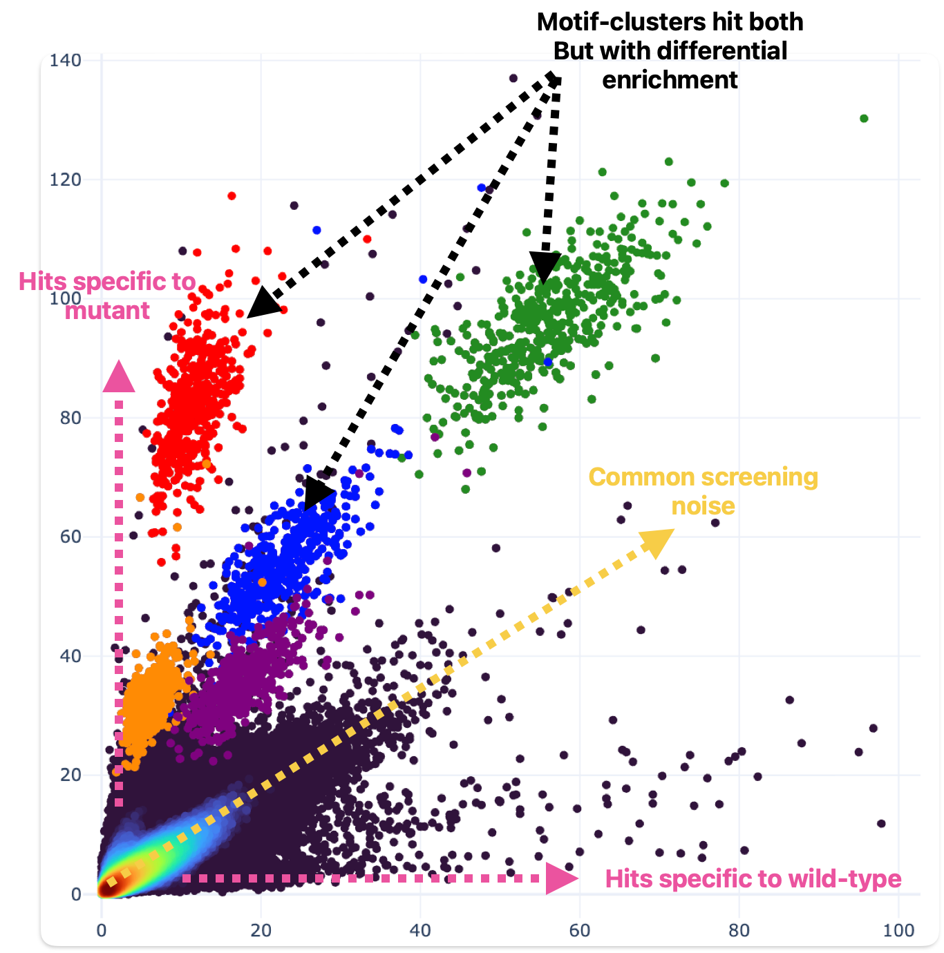 Figure 6. Single amino acid substitutions can drive dramatic effects in ligand binding behavior. One residue was mutated relative to wild-type (wild-type hit enrichment on the X axis; mutant hit enrichment on the Y axis). Motif clusters differ by a single building block.