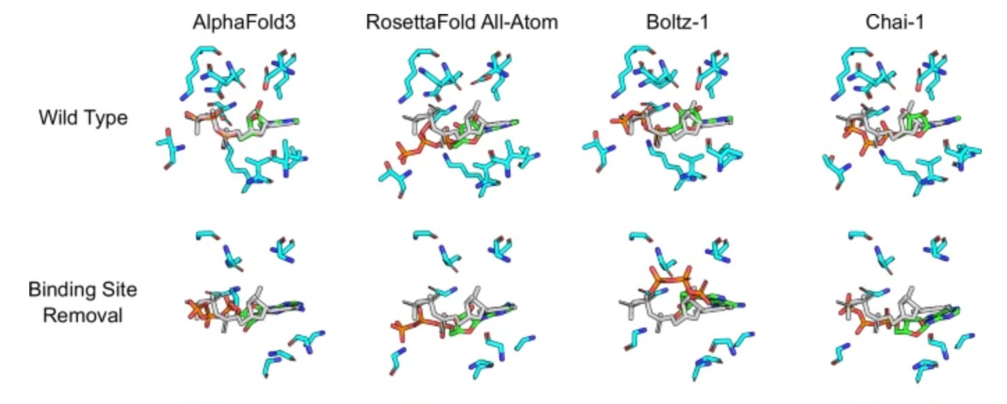 Figure 10. When confronted with missing pockets, cofolding models put the ligands in the same place anyway. Image modified from ref 8.