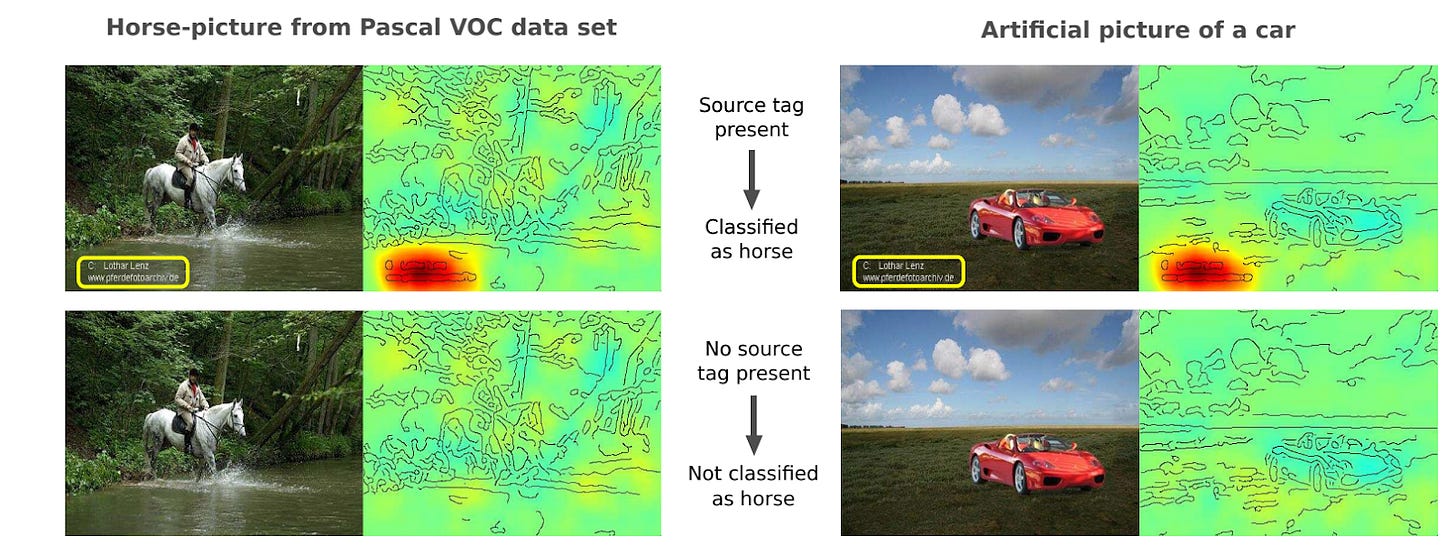 Figure 1. Attention maps suggest models trained on PASCAL VOC look for a photographer watermark when determining if an image contains a horse. Image adapted from ref 3, layer-wise relevance propagation (ref 4) was used to obtain the attention.
